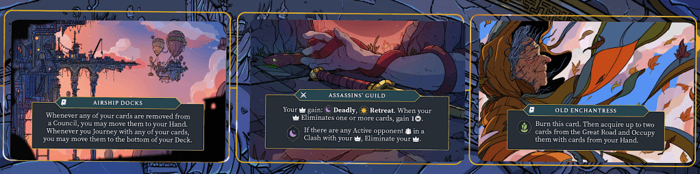 The theme and gameplay loop takes players through seasons of the year over multiple years (5 years or rounds in a regular game) and there are actions and commands available in each season both to help set up the clashes, resolve them and wind down afterwards. Essentially you bid for kingdom cards, play faction cards and supporters into regions, resolve those regions in clashes, claim location rewards and then boost your faction by governing and journeying to gather Lore to spend on more cards … and repeat.