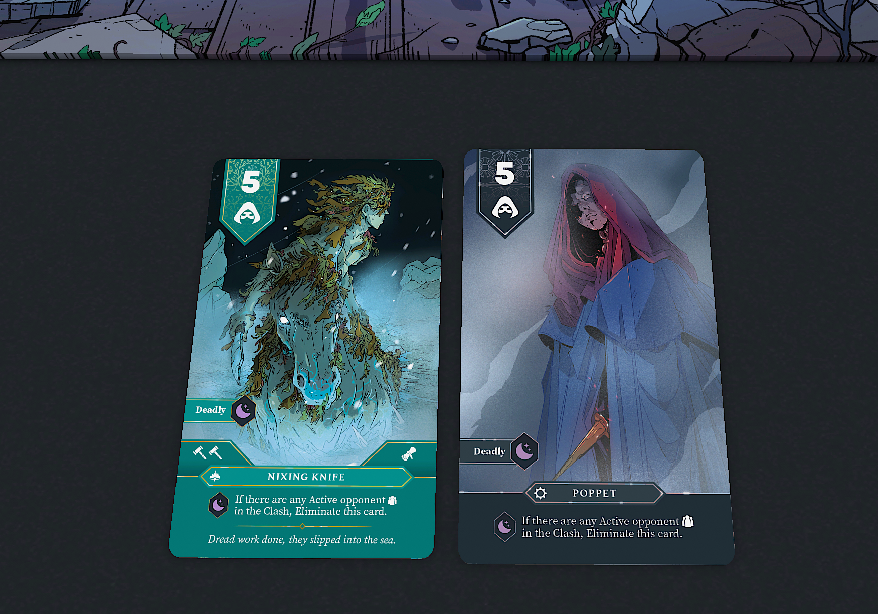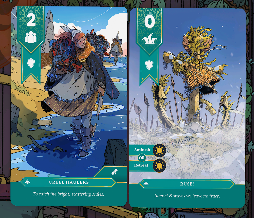 While factions start with the same cards, how you use them, what you gain and what your faction can do with them quickly show the asymmetry here, as well as the intricacies and difficulty in the rules. Bid with your 8 strength Captain? Well, you might not see them again as they guard the prize. Bid low though and risk your reward being stolen next time. Place 1 card face down in each of the three regions, begin clashes comparing cards played by all players and activate anything you can do to help swing the victory in your favour. Everything you do reveals a little more of your game plan to your opponent. There’s loads of fun strategy and misdirection to utilise too though, and it can be ruthlessly cutthroat. Played a Ruse? Then ambush in another card to take the victory or retreat and get out of an unwinnable situation.
