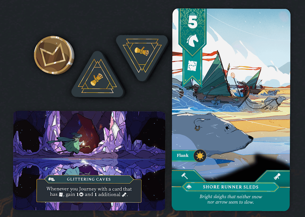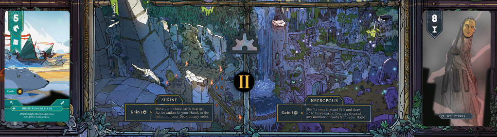 With Heralds posted in the Wilderness, the Clans gain two Influence and steal one more from the Sim’s own cache. Being so high in the Kingdom, the peaks of this location act as the perfect lookout post and Shore Runner Sleds, no longer petrified on the spot, journey back via the Glittering Caves collecting yet more Influence and lore to bring home. A fruitful end of the season for the Clans.