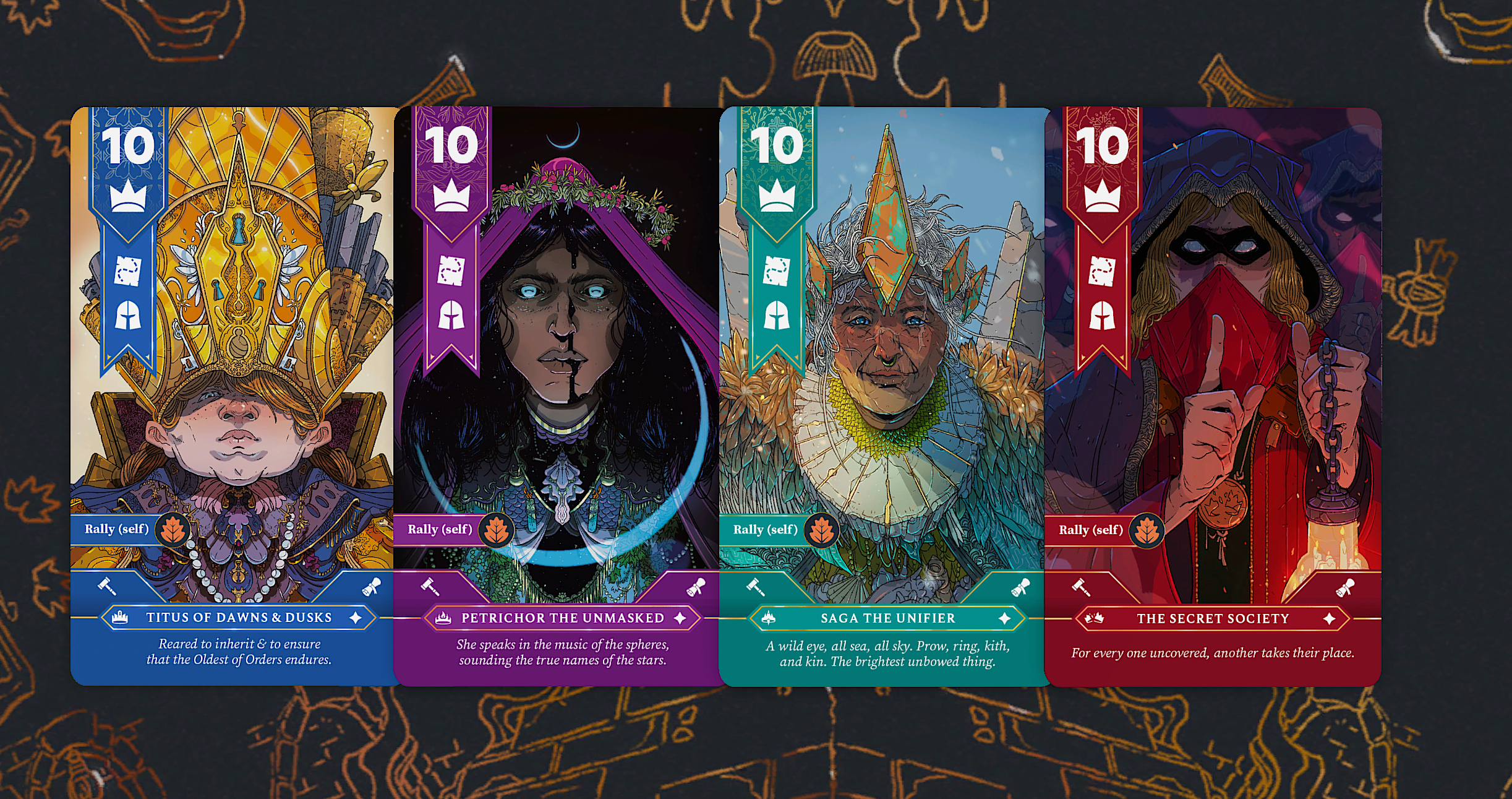 In the regular game, two to four players of warring factions compete to earn the most Influence and claim the titular Old King’s Crown. In the solo mode, the player chooses one of these factions to compete against the automated Simulacrum (Sim). I have played against the regular Sim a handful of times now and have grown to love how the game unfolds and the way this opponent is handled.