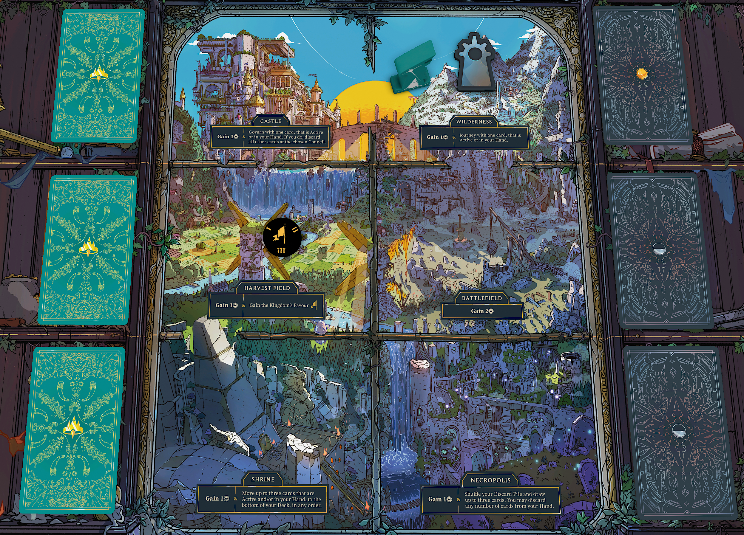 The theme and gameplay loop takes players through seasons of the year over multiple years (5 years or rounds in a regular game) and there are actions and commands available in each season both to help set up the clashes, resolve them and wind down afterwards. Essentially you bid for kingdom cards, play faction cards and supporters into regions, resolve those regions in clashes, claim location rewards and then boost your faction by governing and journeying to gather Lore to spend on more cards … and repeat.