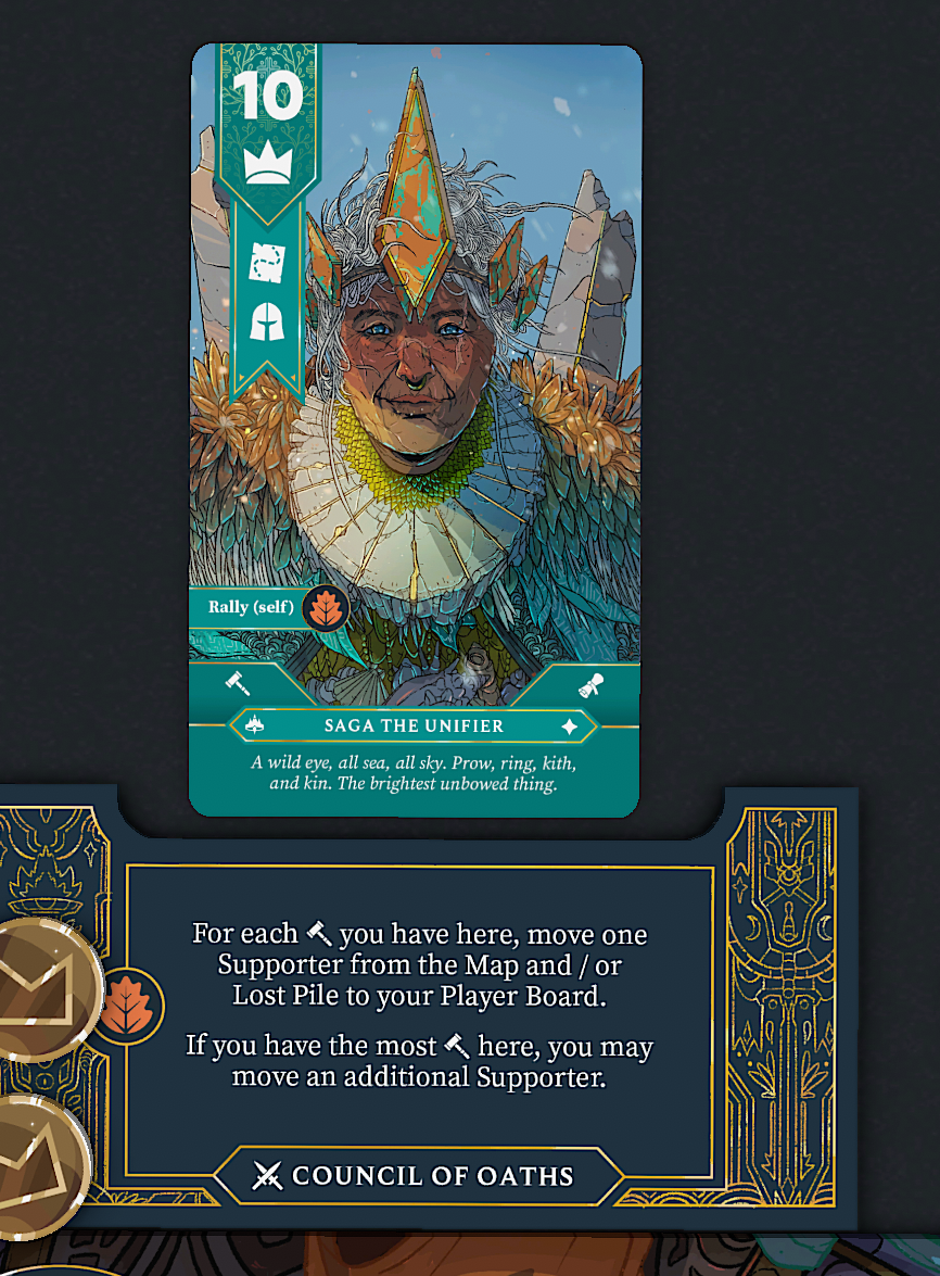 With Heralds posted in the Wilderness, the Clans gain two Influence and steal one more from the Sim’s own cache. Being so high in the Kingdom, the peaks of this location act as the perfect lookout post and Shore Runner Sleds, no longer petrified on the spot, journey back via the Glittering Caves collecting yet more Influence and lore to bring home. A fruitful end of the season for the Clans.